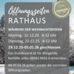 In der Woche vom 29.12.2025 bis einschließlich 05.01.2026 ist das Rathaus und die Tourist-Info geschlossen!