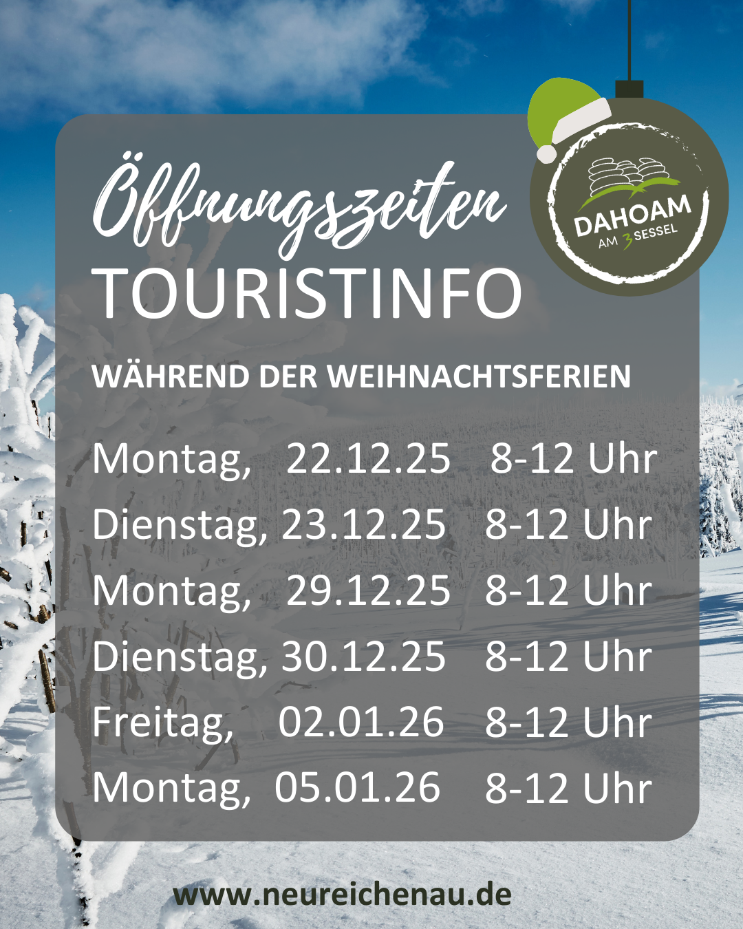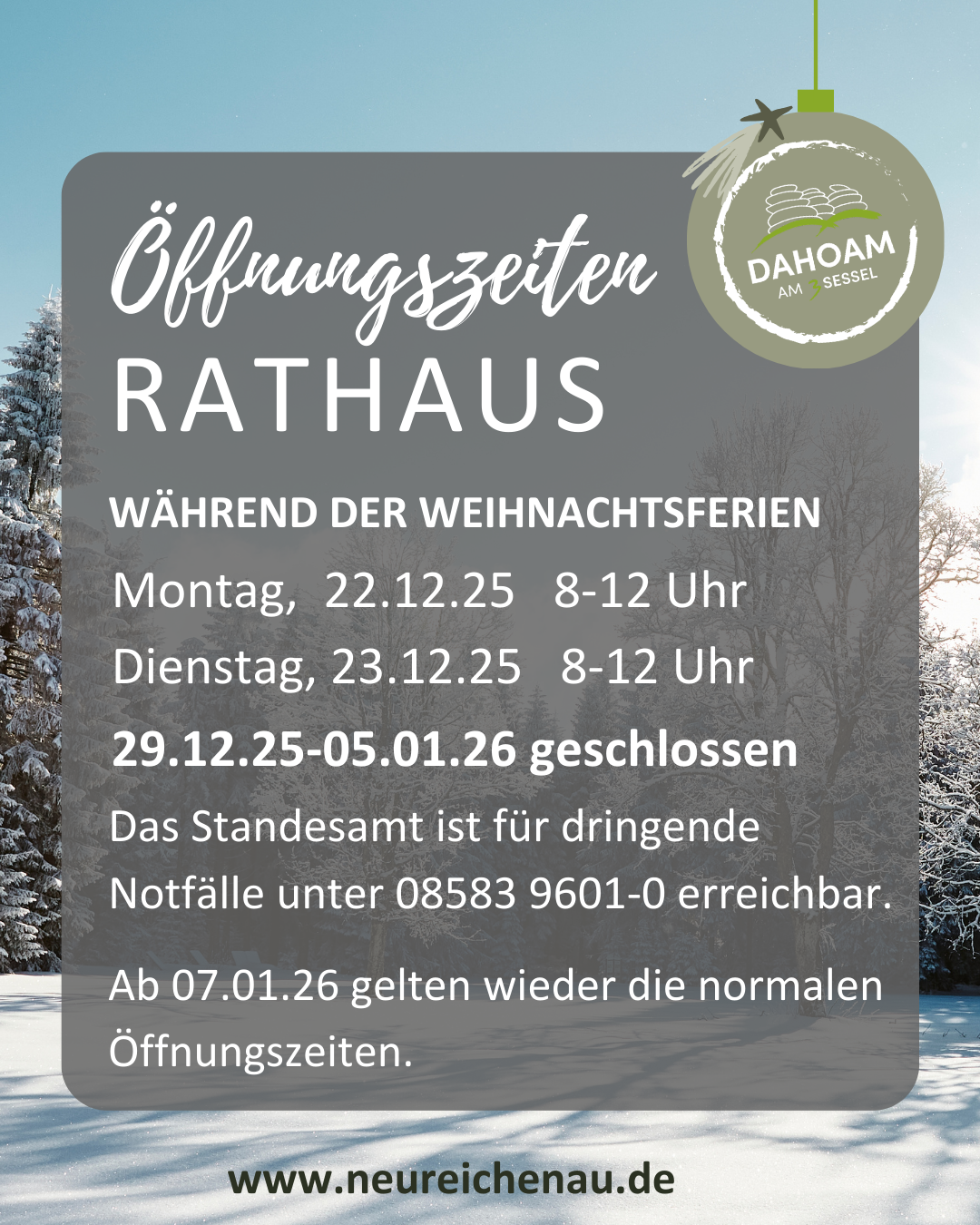 Die Gemeindeverwaltung und Tourist-Info Neureichenau passen ihre Öffnungszeiten über Weihnachten und den Jahreswechsel an. Ein Bereitschaftsdienst sichert die Erreichbarkeit.