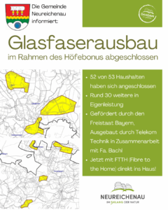 Denn die Gemeinde Neureichenau wurde vom Bundesministerium für Digitales und Verkehr (BMDV) im Rahmen der Gigabitrichtlinie RL 2.0 für den geförderten Ausbau ausgewählt. Dank der großzügigen finanziellen Unterstützung des Bundes sowie der Kofinanzierung durch den Freistaat Bayern ist die Gemeinde Neureichenau nun in der Lage, einen flächendeckenden Gigabitausbau für alle Haushalte umzusetzen. Der Ausbau erfolgt für alle Eigentümer kostenfrei und ist freiwillig – es besteht kein Anschlusszwang, sofern kein Bedarf besteht. Zum jetzigen Zeitpunkt können noch keine verbindlichen Angaben zum zeitlichen Ablauf gemacht werden. Alle Bürgerinnen und Bürger werden rechtzeitig und umfassend informiert, sobald weitere Details vorliegen.