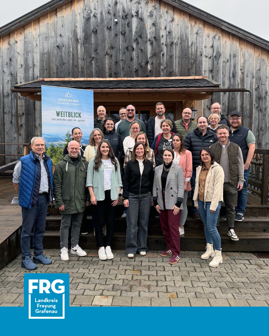 - Die Tourismusschaffenden des Landkreises Freyung-Grafenau vor dem Brennereistadel der Woid-Hoamat in Schönbrunn am Lusen. Foto: Landratsamt Freyung-Grafenau