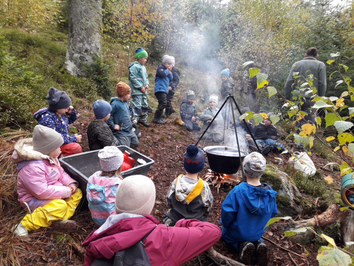 Anschließend sammelten die Entdecker Fichtenzweige und Himmbeerblätter und kochten in einem Feuerkessel einen leckeren Waldtee. Diesen ließen sie sich bei einer spannenden Geschichte über den Specht schmecken.