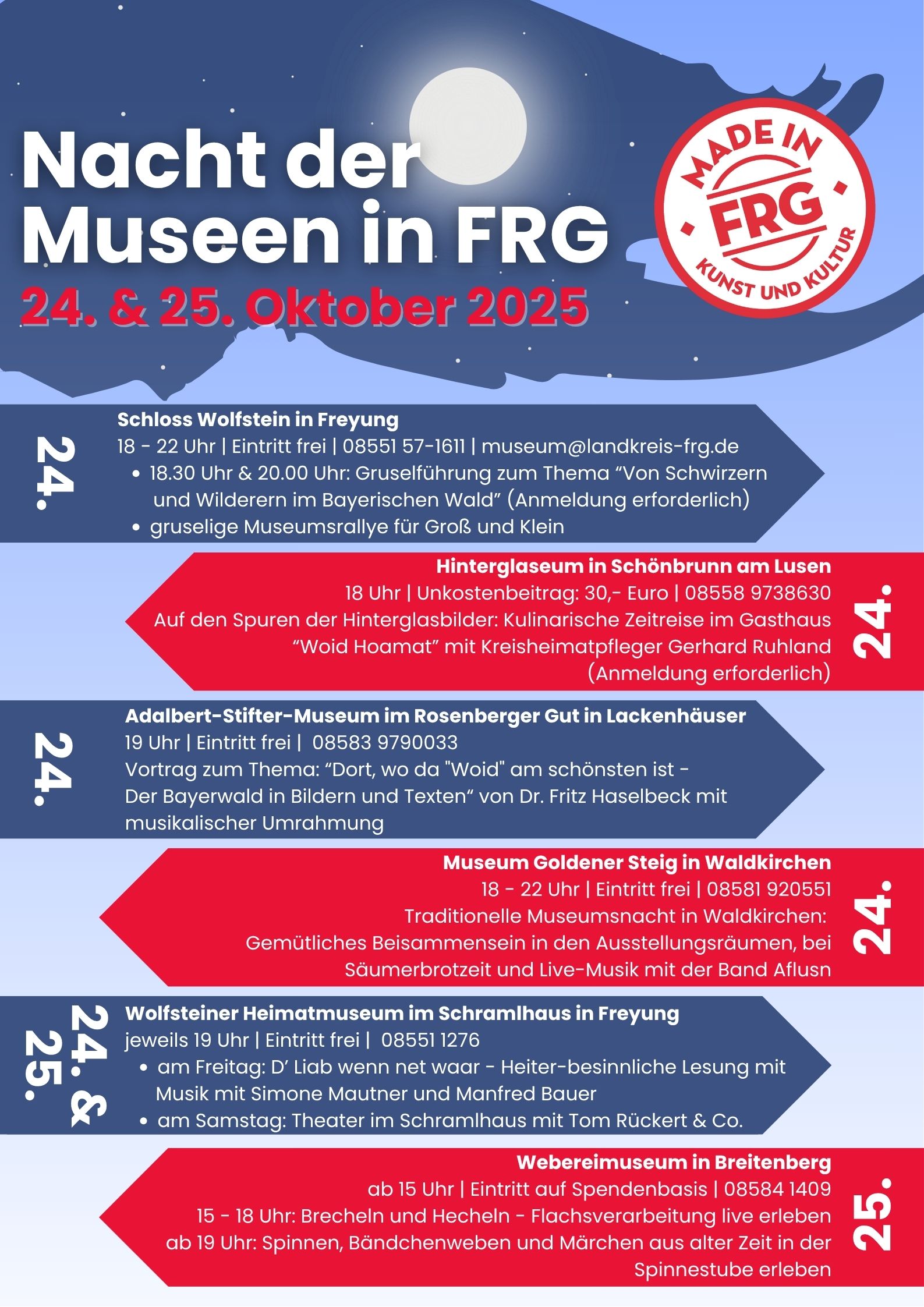 Am 24. und 25. Oktober 2025 heißt es im Landkreis Freyung-Grafenau zum ersten Mal: Türen auf für die Nacht der Museen in FRG! Die Museumsnächte haben bereits eine lange Tradition in den einzelnen Häusern. Das neue Veranstaltungsformat ist im vergangenen Jahr aus dem Netzwerk der Museen entstanden und lädt Kultur- und Geschichtsbegeisterte ebenso wie Familien zu einem abwechslungsreichen Abendprogramm ein.
